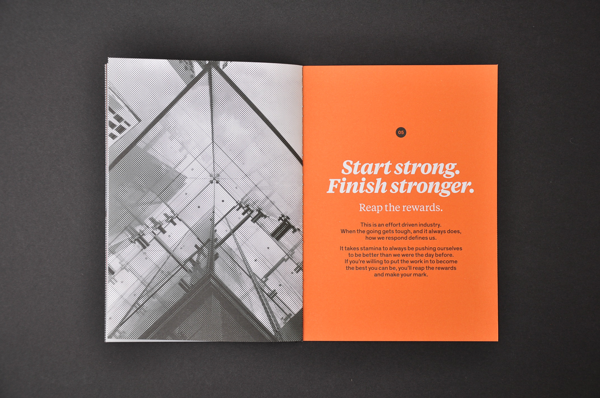 Two print items — a booklet and poster — were designed and distributed company-wide to offices and construction sites, serving as a daily reminder of how to get the most out of work.