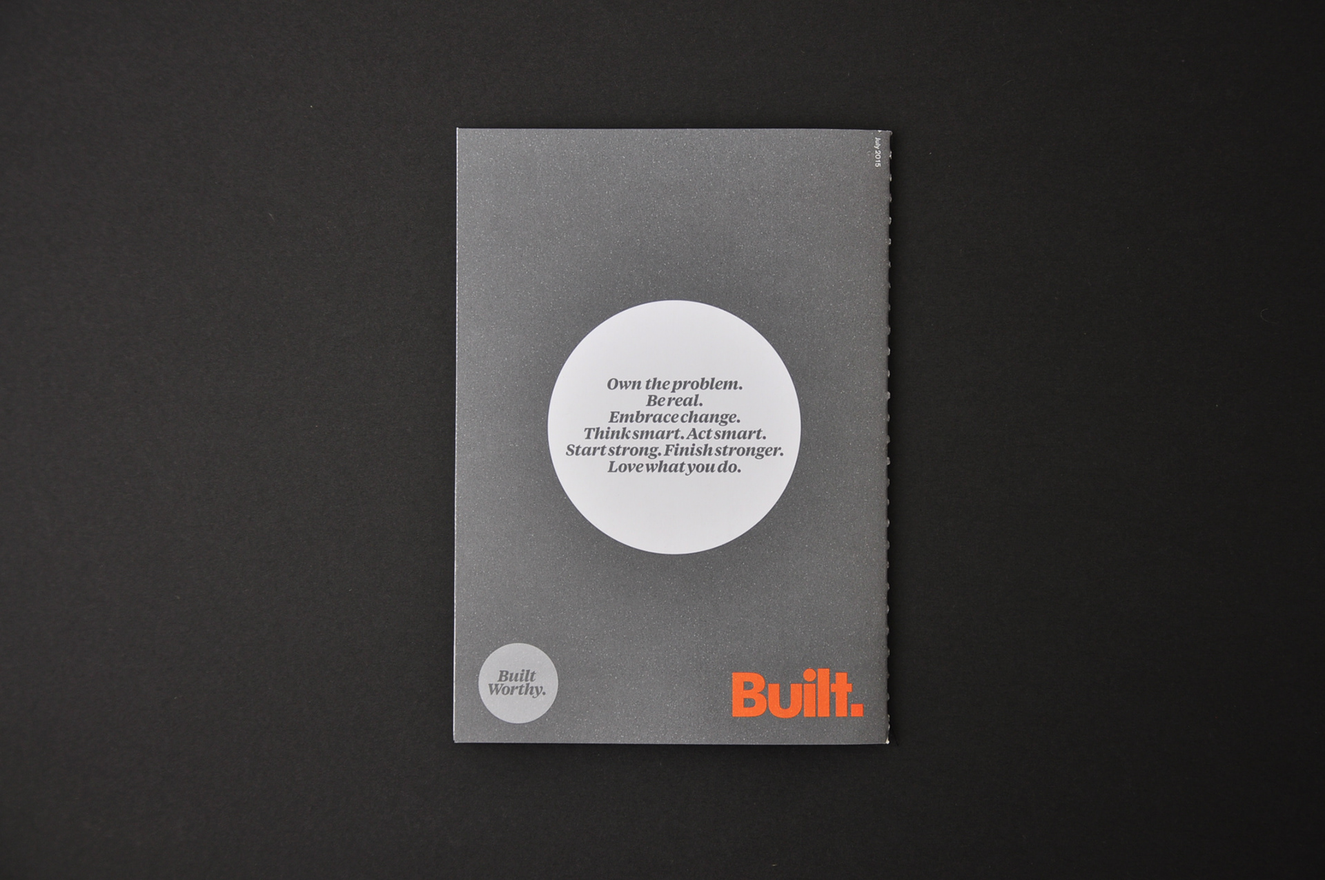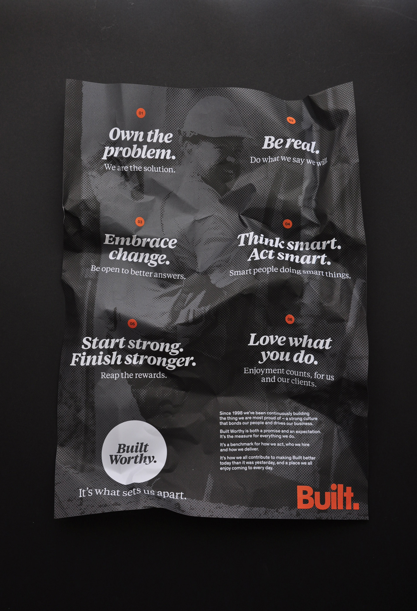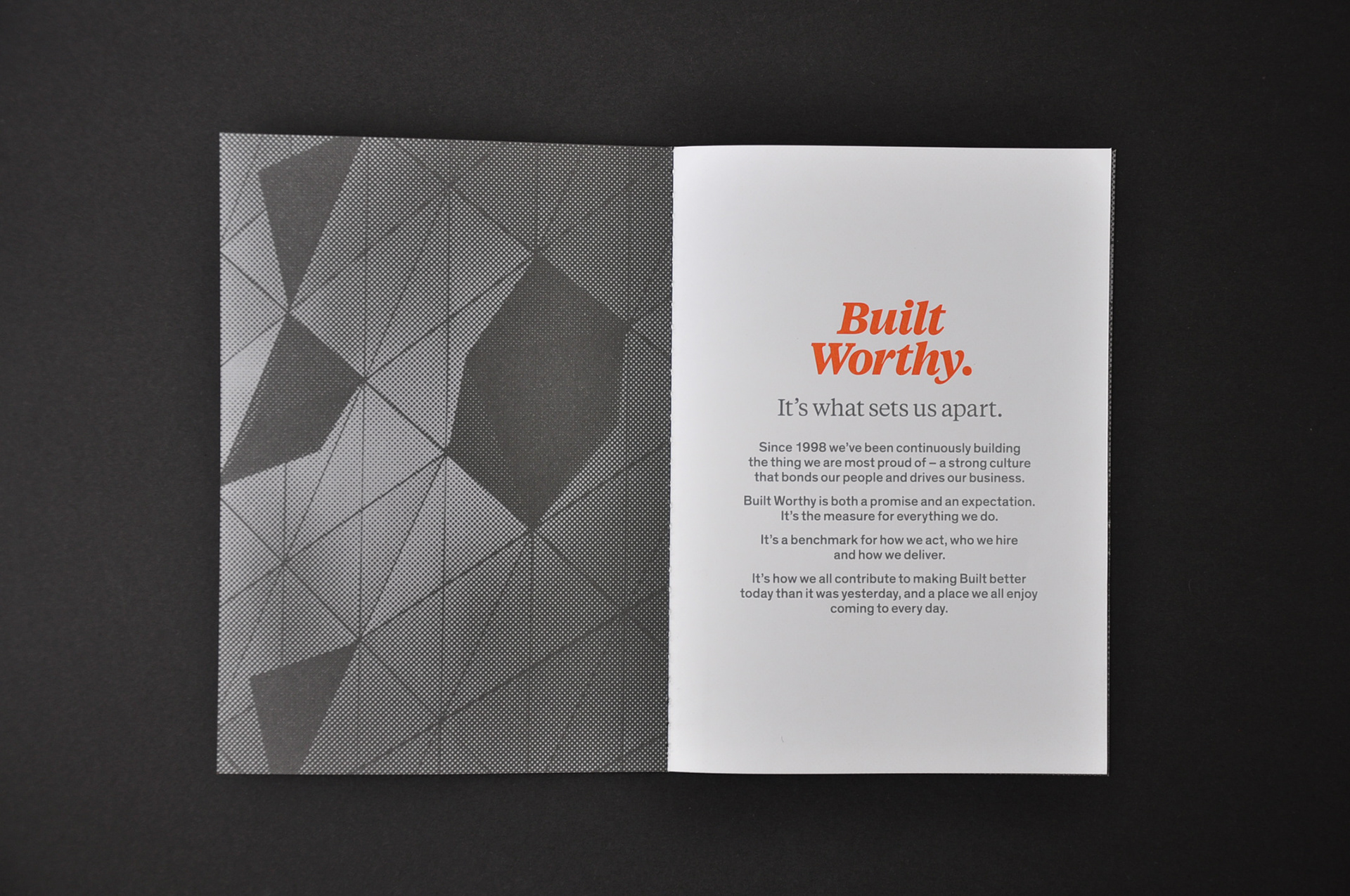 Working with the brand guidelines, a 'Built Worthy' graphic device was suggested for greater consistency across their communications and to help build recognition, and a gritty ‘hard-working’ imagery style was developed that would help differentiate from the main identity.